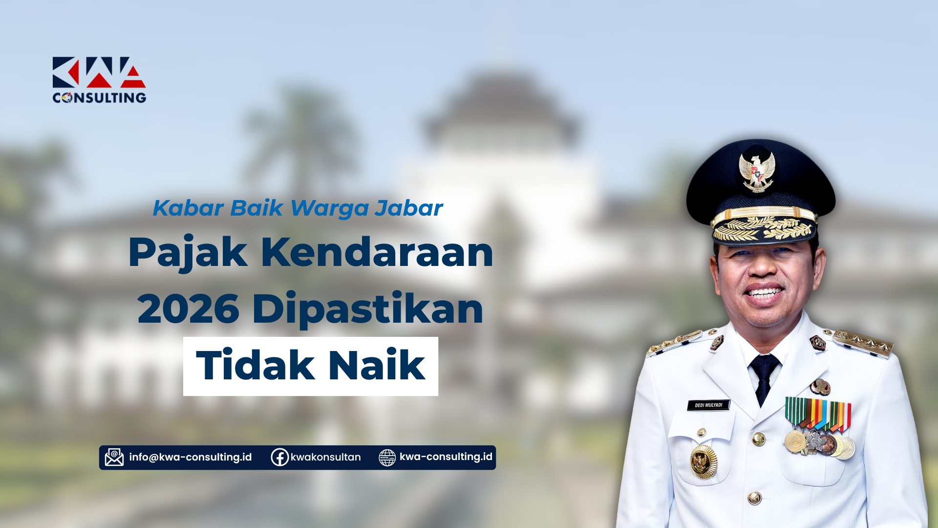 PKB dan BBNKB kendaraan pribadi di Jawa Barat tidak mengalami kenaikan pada 2026, bahkan kendaraan berpelat kuning mendapat penurunan tarif sebagai bentuk stimulus dan dukungan pembangunan daerah. Solusinya, wajib pajak sebaiknya memanfaatkan kebijakan ini dengan tetap taat membayar pajak dan mengelola kewajiban perpajakan secara tepat. Untuk memastikan pajak Anda aman, efisien, dan sesuai aturan, konsultasikan langsung dengan KWA Konsulting.